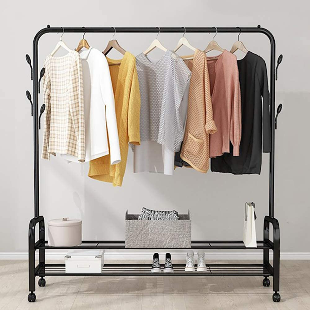 Există, de asemenea, două rafturi pentru depozitarea pantofilor și un suport unde vă puteți păstra hainele pe umerașe și este dotat cu umerașe pe ambele părți. Greutatea sa redusă și roțile din partea inferioară îl fac ușor de mutat și de repoziționat.